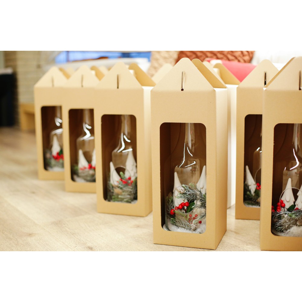 DEKORACJA-BUTELKA może być zapakowana w kartonowe dekoracyjne pudełko. Dodatkowo na pudełku można umieścić logo firmy, bądź krótką informację typu życzenia, czy podziękowania lub po prostu: ,,WESOŁYCH ŚWIĄT''