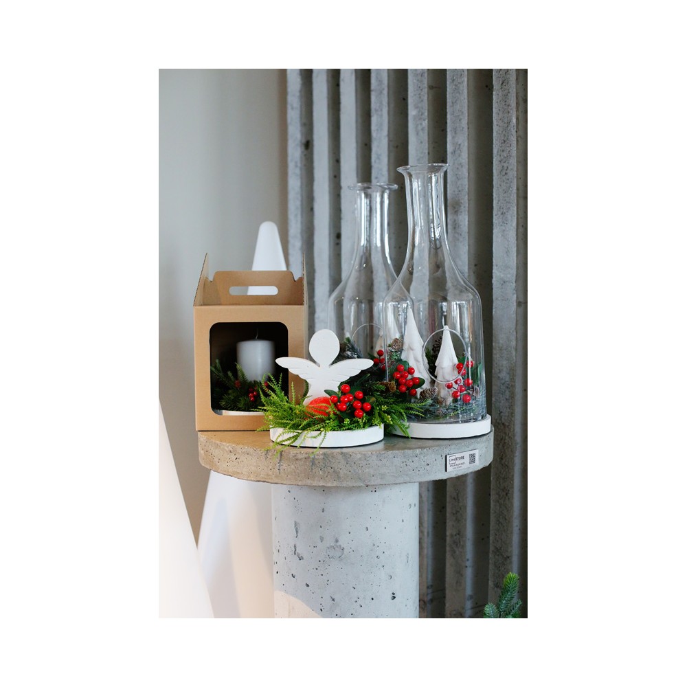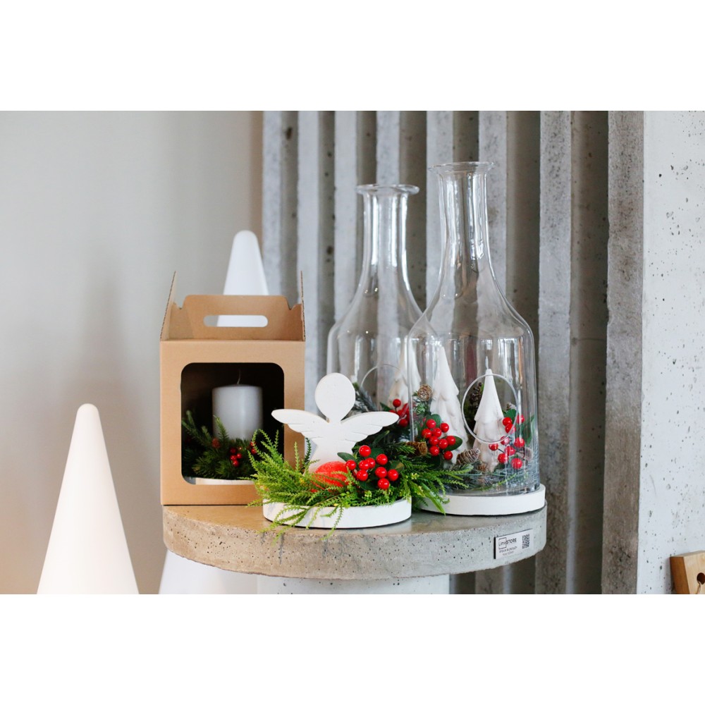 DEKORACJA-BUTELKA, to tradycyjna bożonarodzeniowa kompozycja z elementami nowoczesności w postaci Figurek: Choinki małej i dużej z betonu architektonicznego w białym kolorze, betonowej białej podstawy oraz szklanej butelki z otworem. Jak to brzmi? Wyjątkowo prawda? Całości dopełnia pachnąca świeca o nasyconej czerwonej barwie w kształcie bombki.