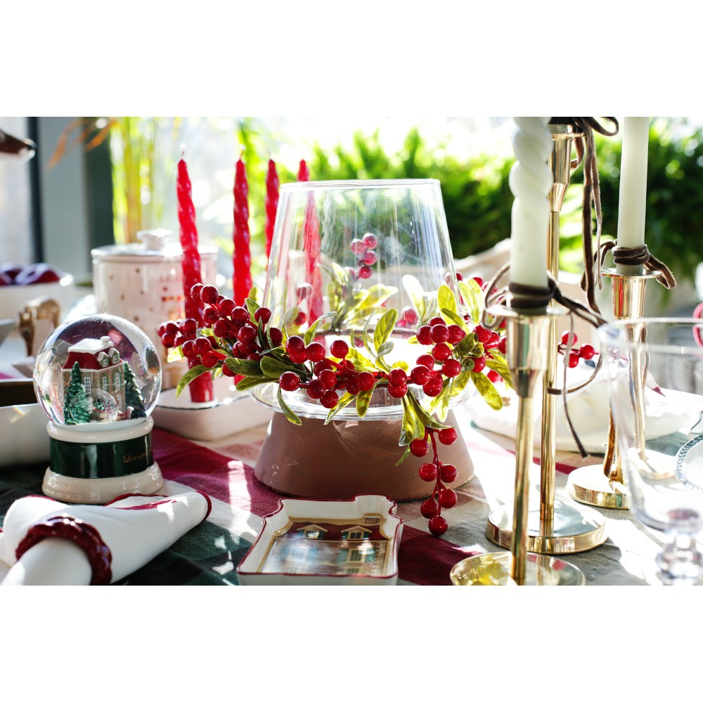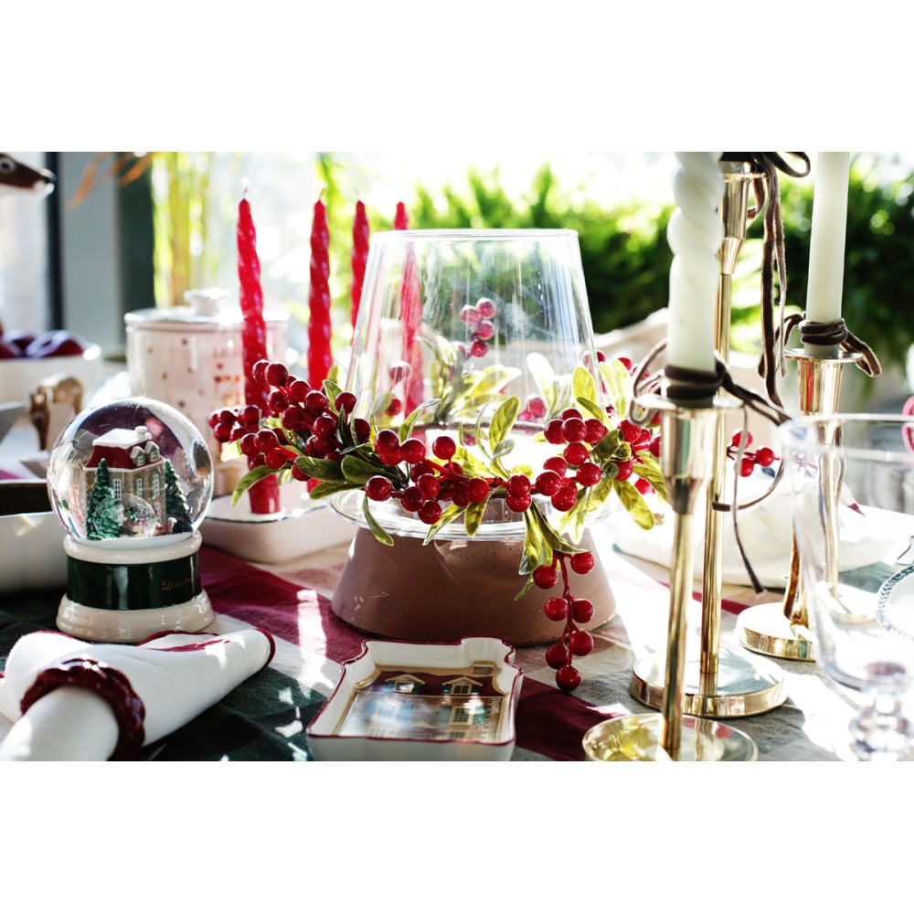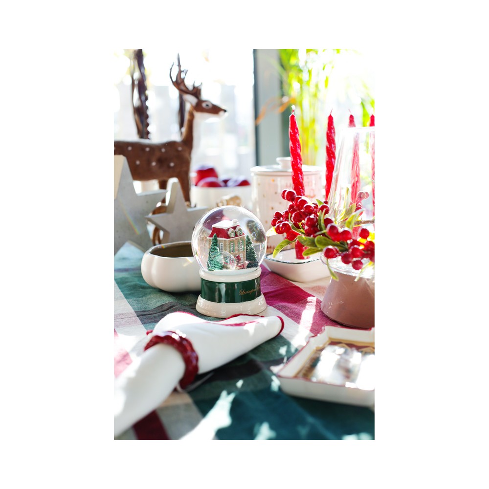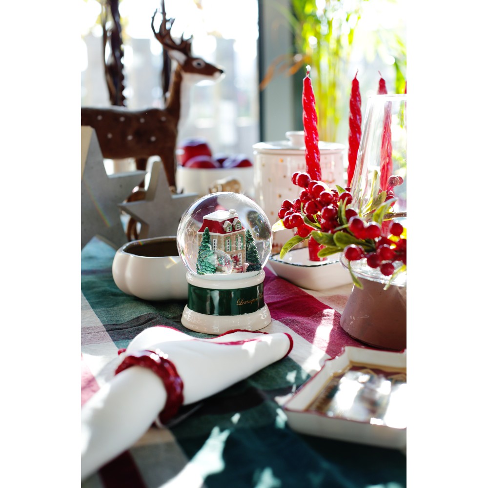 • Wykonany z porcelany w podstawie i żywicy poliestrowej wewnątrz. Woda i śnieżny brokat wewnątrz szklanej kuli.