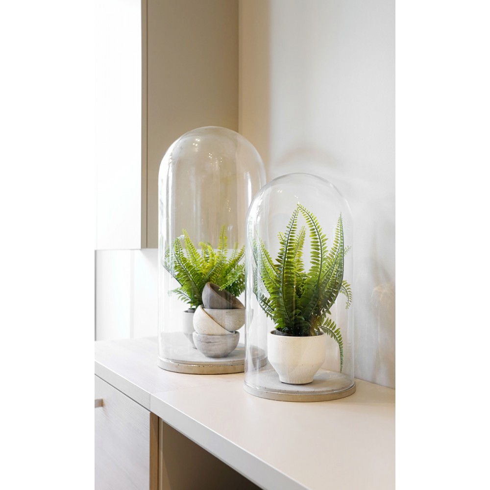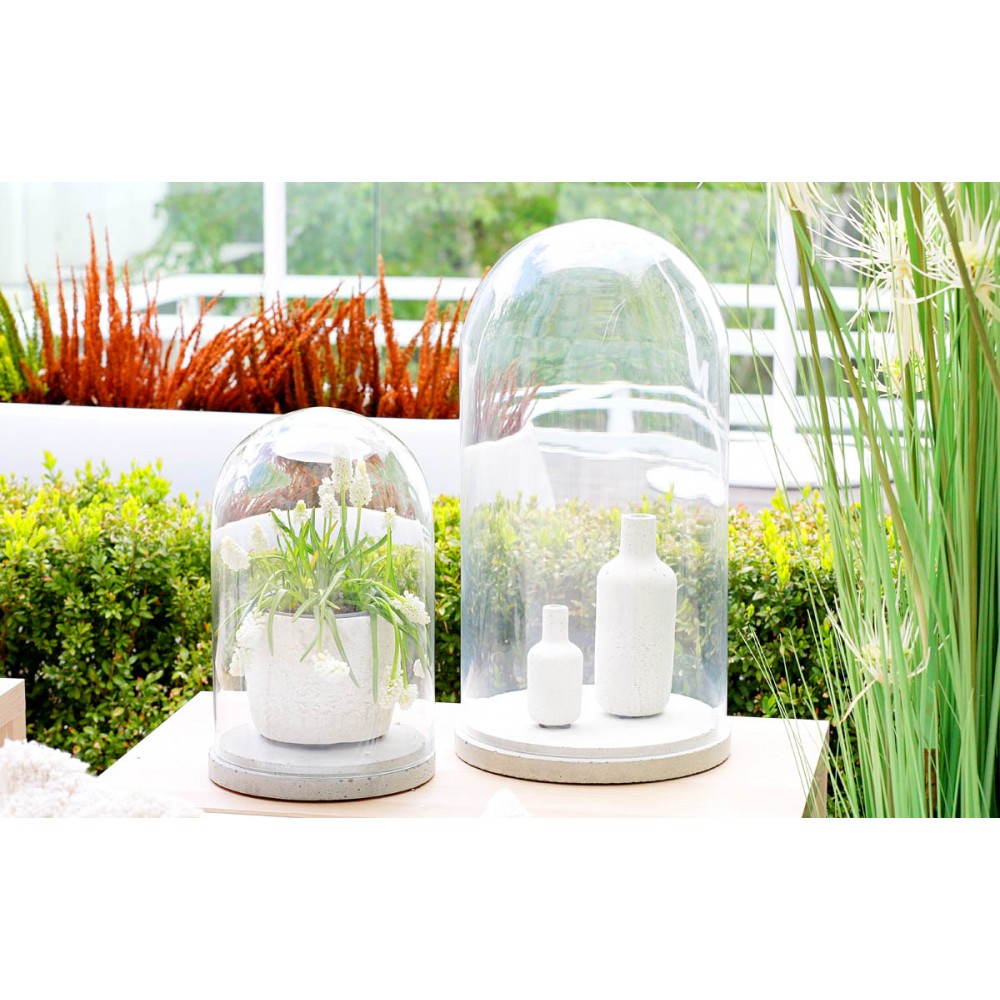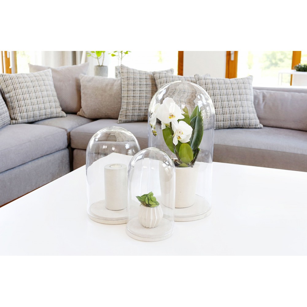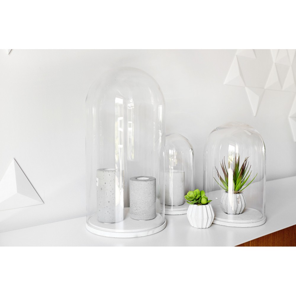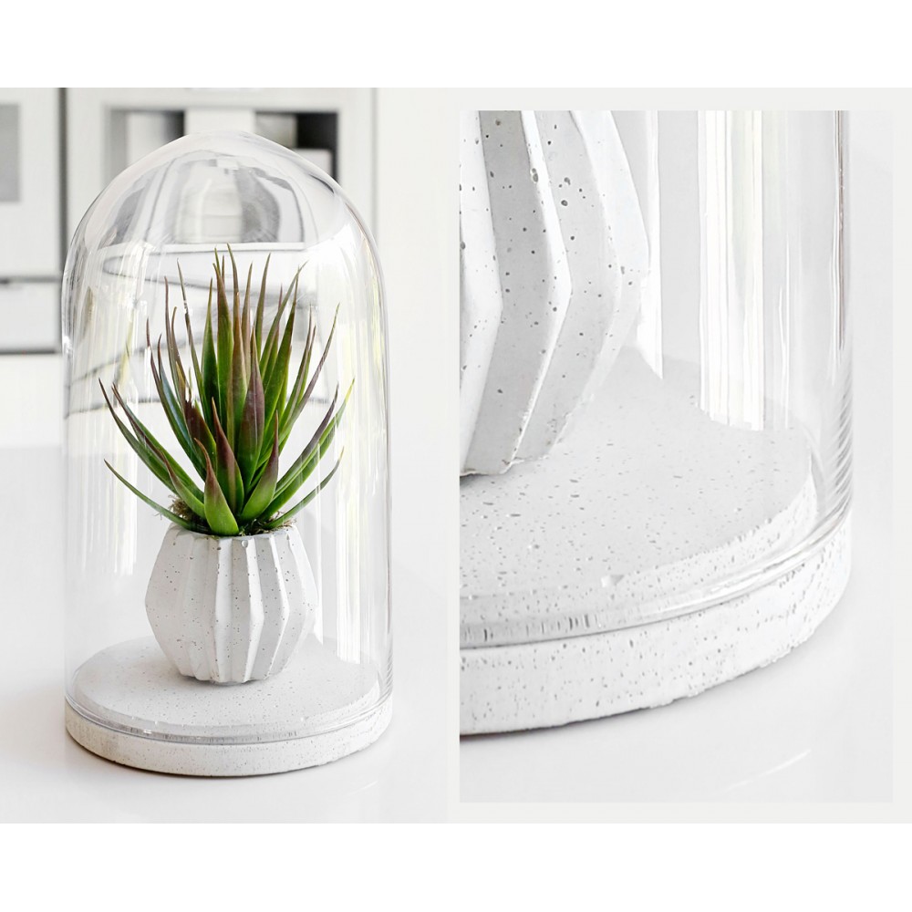 Szklany klosz to bardzo ciekawy element dekoracyjny, który idealnie sprawdzi się do wyeksponowania zarówno sztucznych, jak i żywych roślin. Z kolei dzięki wykorzystaniu podstawy z betonu architektonicznego z powodzeniem można go również wykorzystać w formie tacy, która posłuży nam do serwowania owoców lub słodkości.